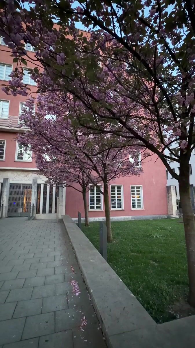 Topics: cherry blossom, pink building, modern architecture, spring bloom, urban landscape, residential, nature, seasonal, european, daily life