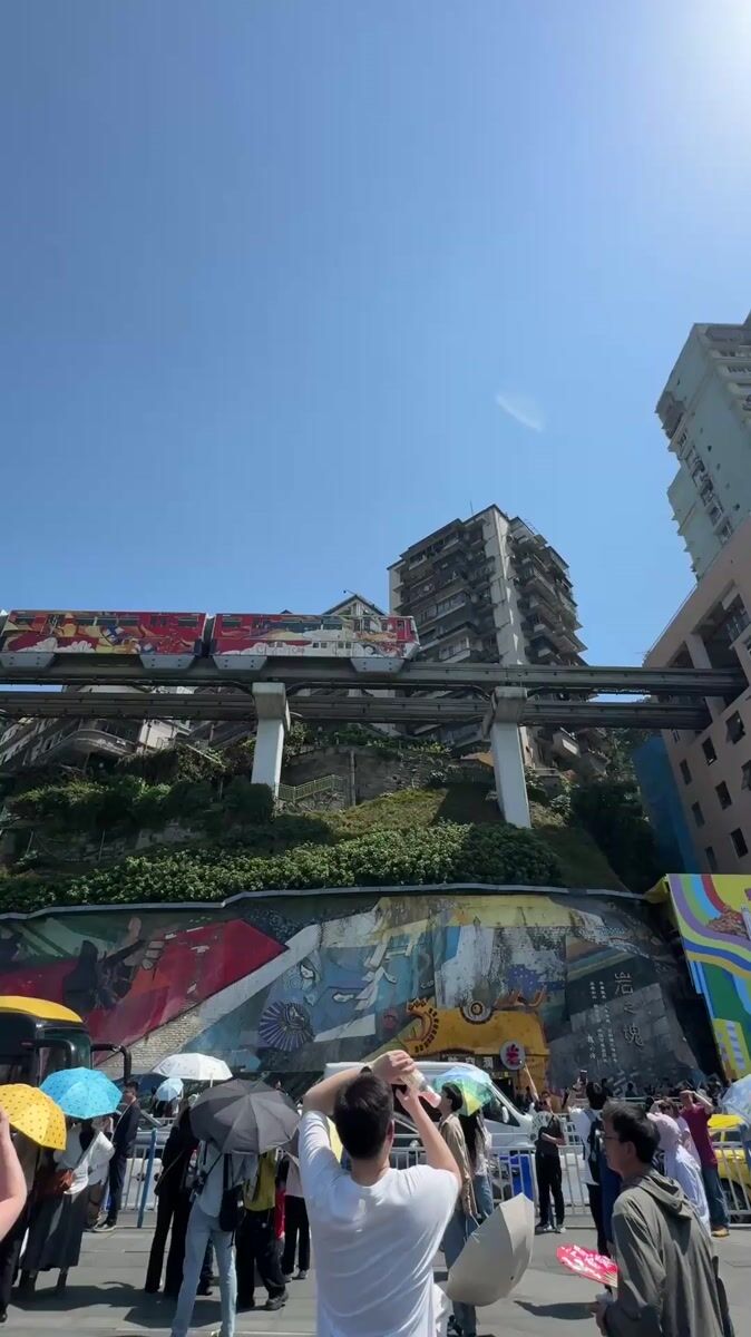 Topics: liziba station, elevated train, colorful mural, train spotting, urban transit, crowd gathering, chongqing, transportation, urban, daily life