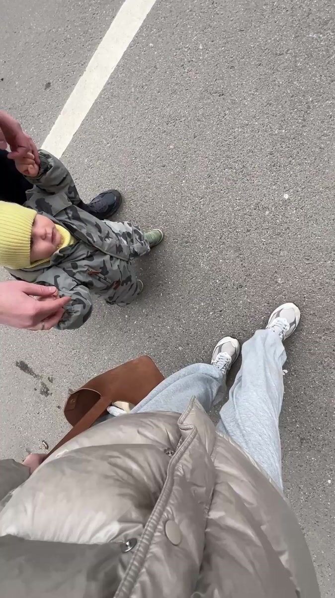 Three people walk on asphalt captured in overhead video