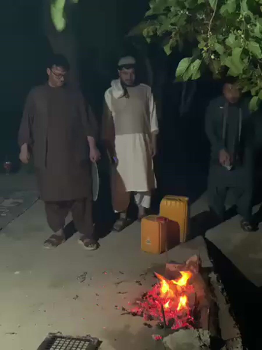 Topics: outdoor cooking, grilling, bonfire, traditional clothing, nighttime gathering, food preparation, community, rural life, daily life, social
