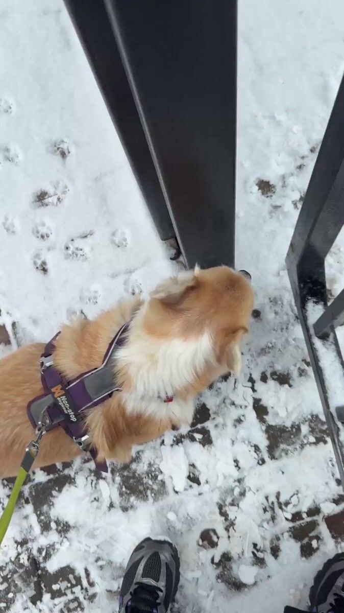 Topics: corgi dog, snow walk, purple harness, pet walking, early morning, winter weather, urban pets, daily life, domestic, lifestyle