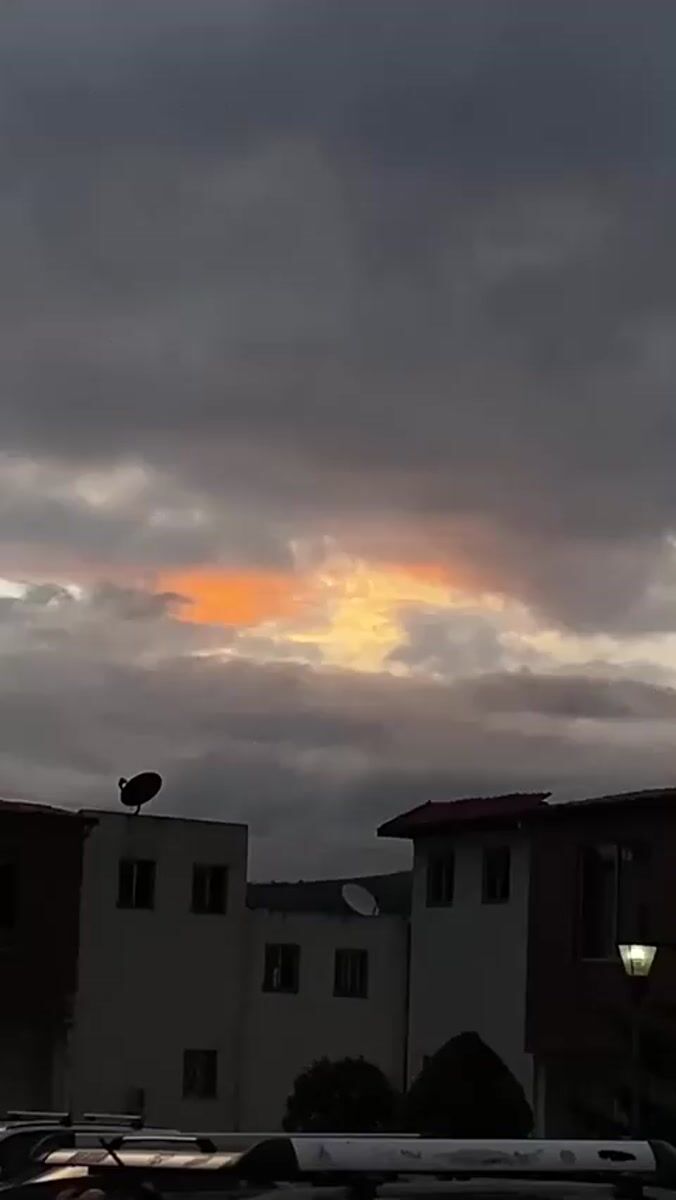 Topics: orange light, cloudy sky, atmospheric phenomenon, evening sky, residential area, urban landscape, weather, natural light, cityscape, daily life