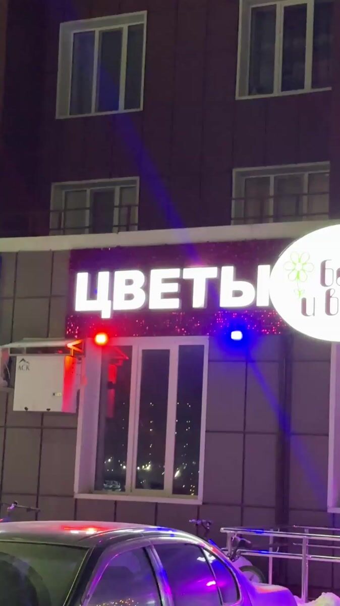 Illuminated flower shop observed at night in Nizhnevartovsk