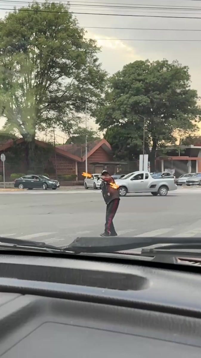 Street performer juggles fire in Puebla intersection