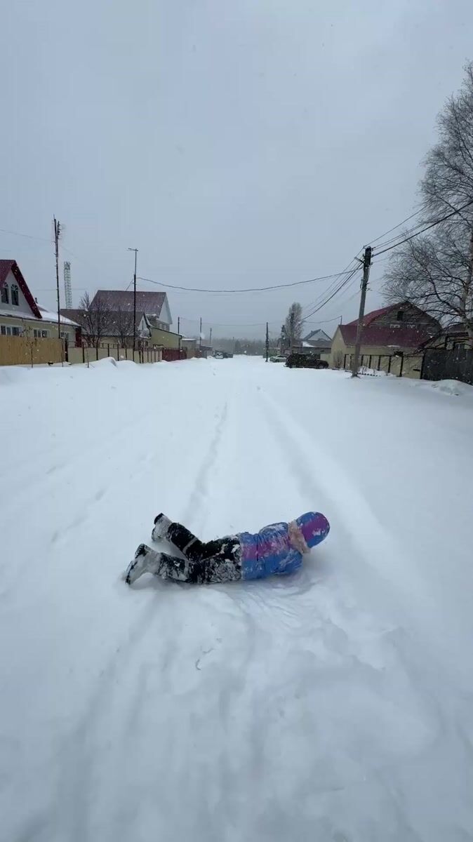 Child plays in deep snow on residential street in Russia
