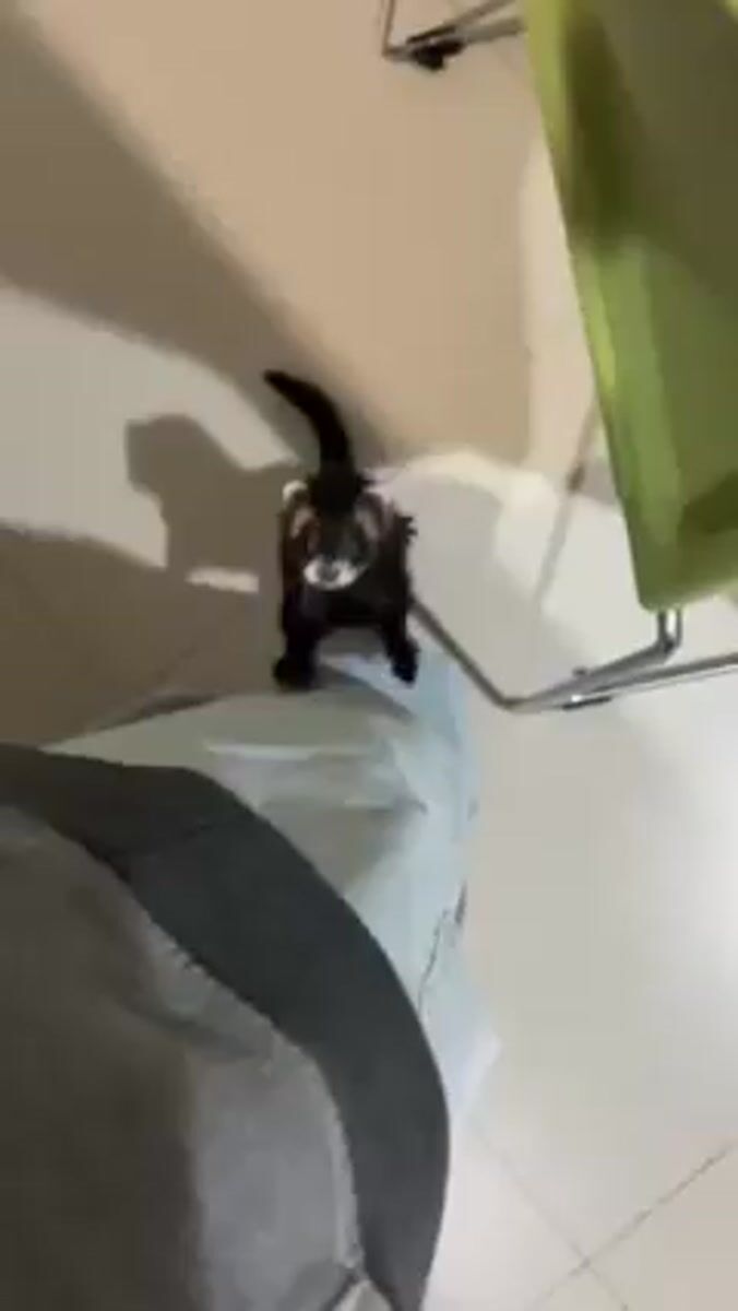 Topics: pet ferret, domestic play, kitchen activity, pet behavior, home life, animal companion, indoor scene, daily life, domestic, lifestyle