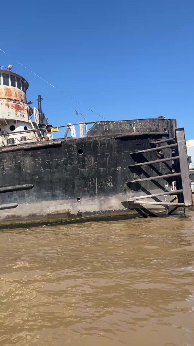 Topics: rusted tugboat, abandoned vessel, derelict ship, riverbank, maritime decay, waterway, industrial, abandonment, transport, urban decay