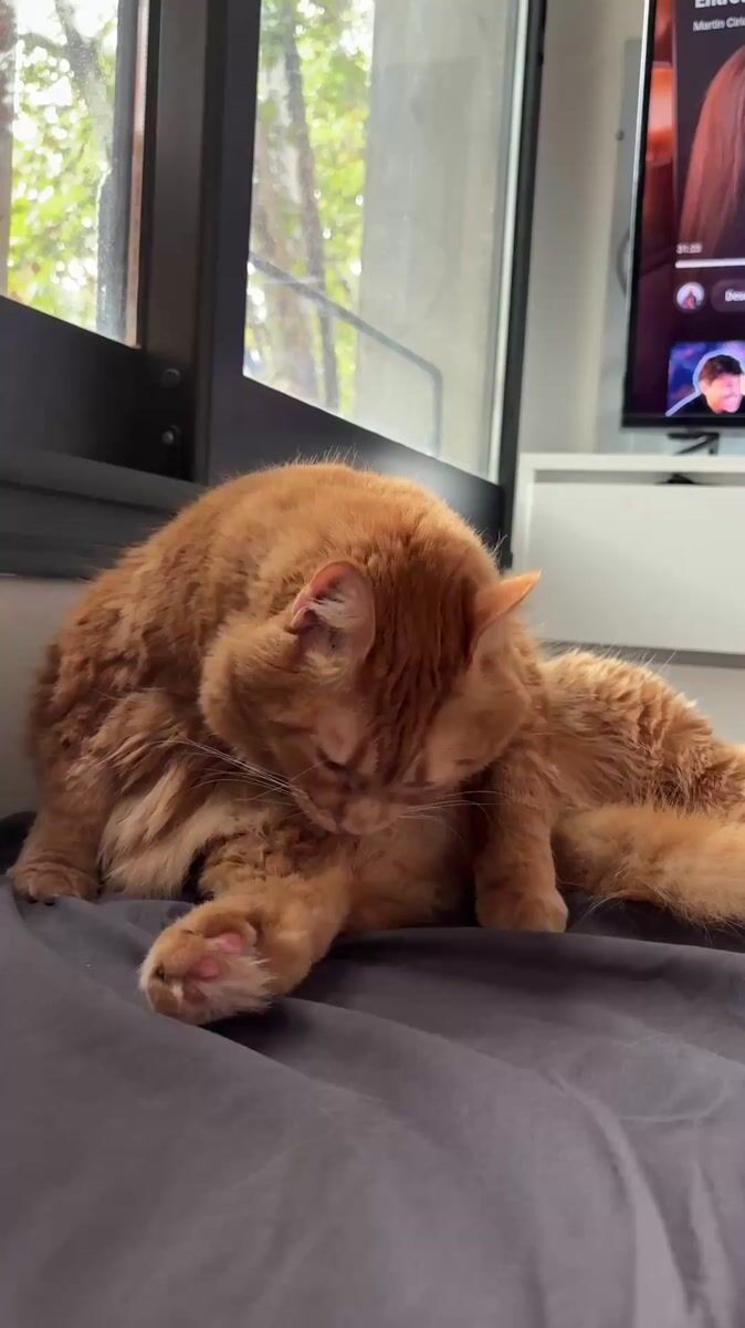 Topics: cat grooming, orange cat, indoor pet, domestic animal, pet care, home environment, animal behavior, domestic life, daily life, lifestyle