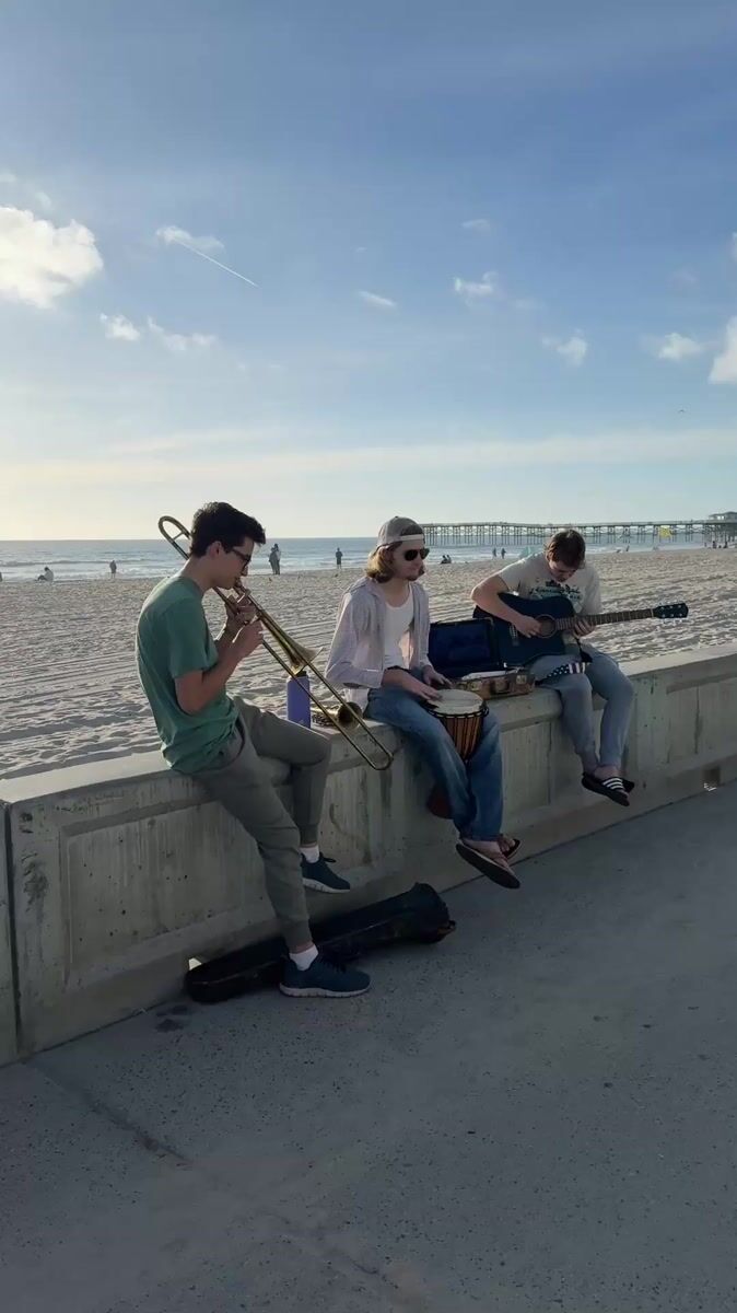 Topics: beach music, trombone, djembe, street performance, impromptu concert, outdoor music, musicians, performance, entertainment, daily life