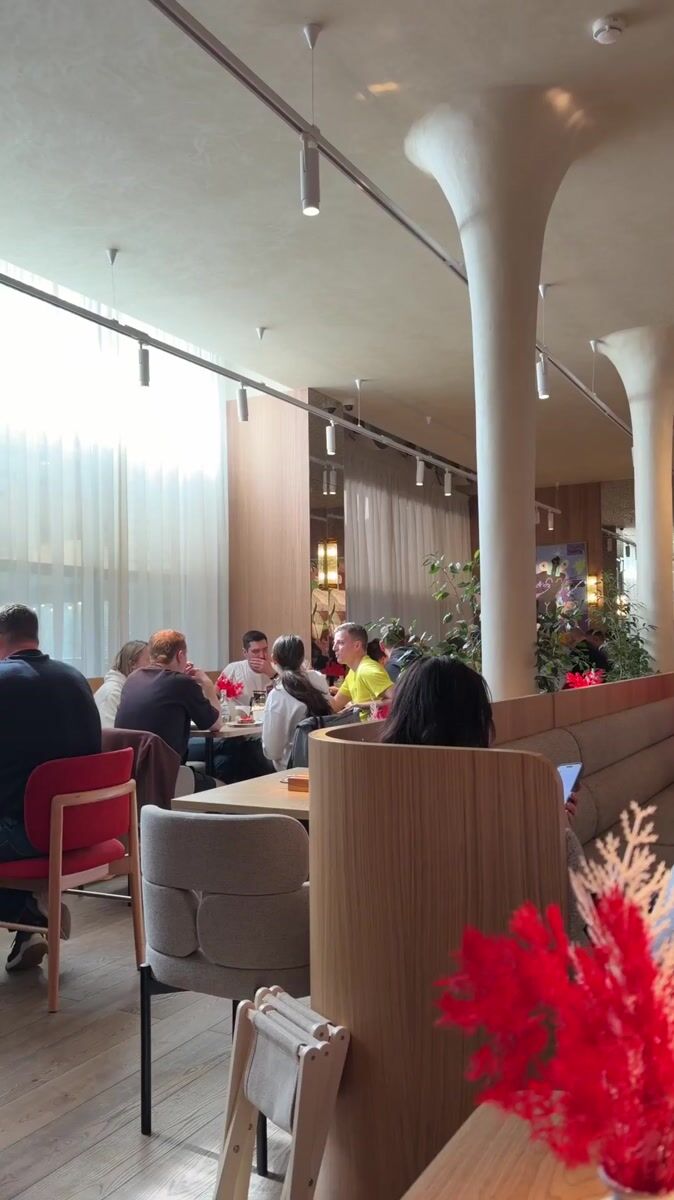 Topics: restaurant interior, morning dining, modern decor, dining, hospitality, social gathering, commercial, urban life, social, daily life