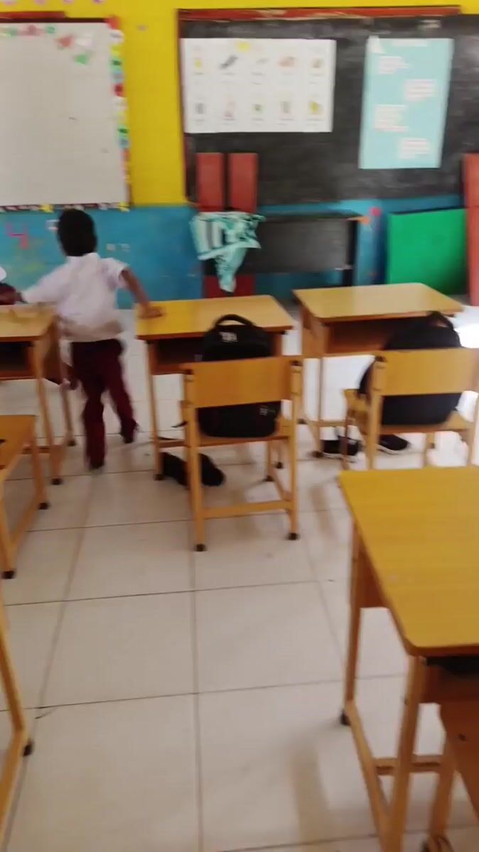 Topics: classroom play, school uniforms, wooden desks, children, school, education, indoor, social, daily life, youth
