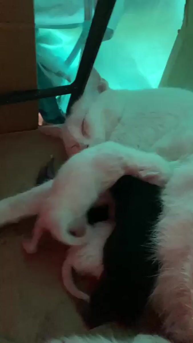 Topics: newborn kitten, nursing cat, heterochromia, cardboard box, cat family, domestic animal, motherhood, pet care, daily life, animal