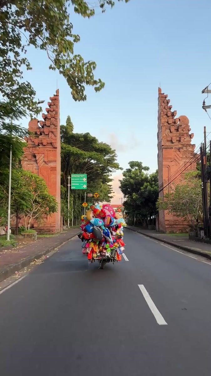 Balloon-laden motorbike spotted on Balinese road near traditional gates