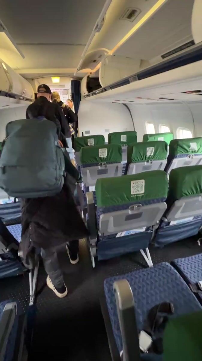 Topics: airplane disembarkation, tezjet flight, aircraft interior, air travel, commercial aviation, passenger transport, transportation, travel, aviation, daily life