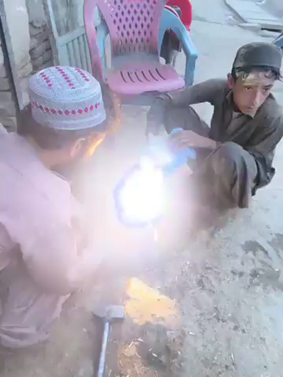 Street welders repair metal components in Kandahar workshop