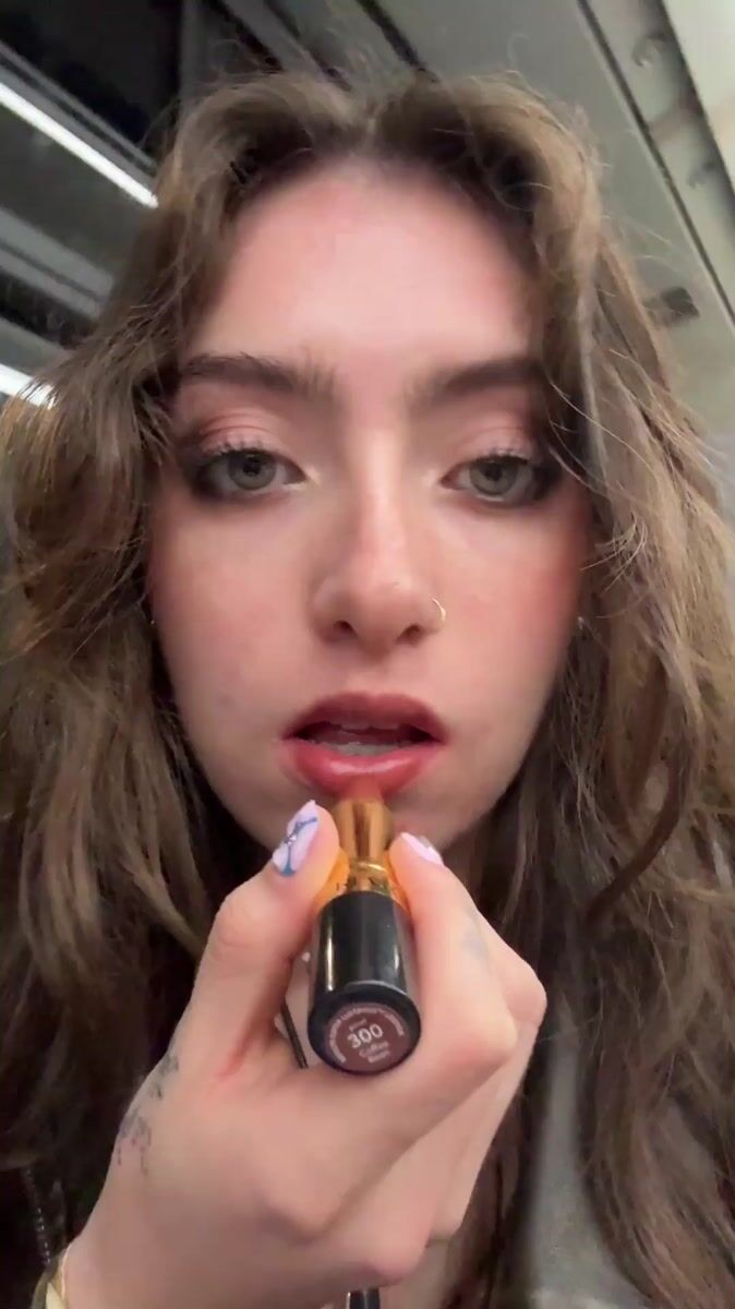 Topics: lipstick application, selfie video, beauty routine, personal care, social media, self recording, lifestyle, daily life, personal, urban