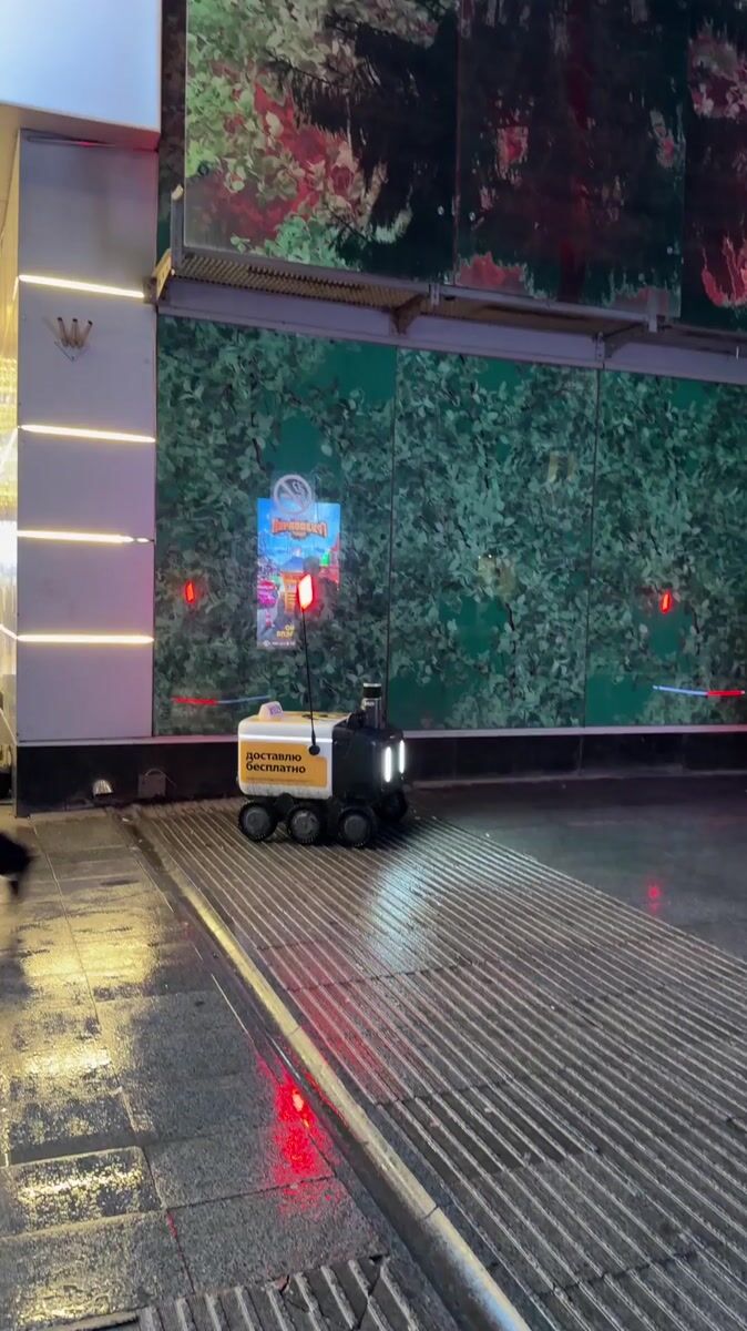 Topics: delivery robot, rainy street, movie theater, urban life, technology, entertainment, weather, daily life, russian city, contemporary