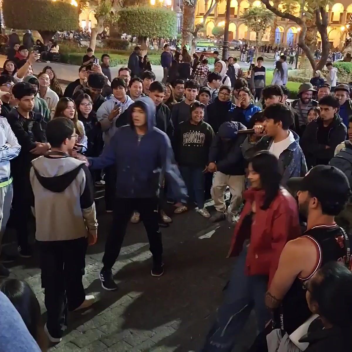 Topics: freestyle rap, street performance, cathedral gathering, nighttime event, youth culture, urban entertainment, social gathering, street art, nightlife, cultural activity