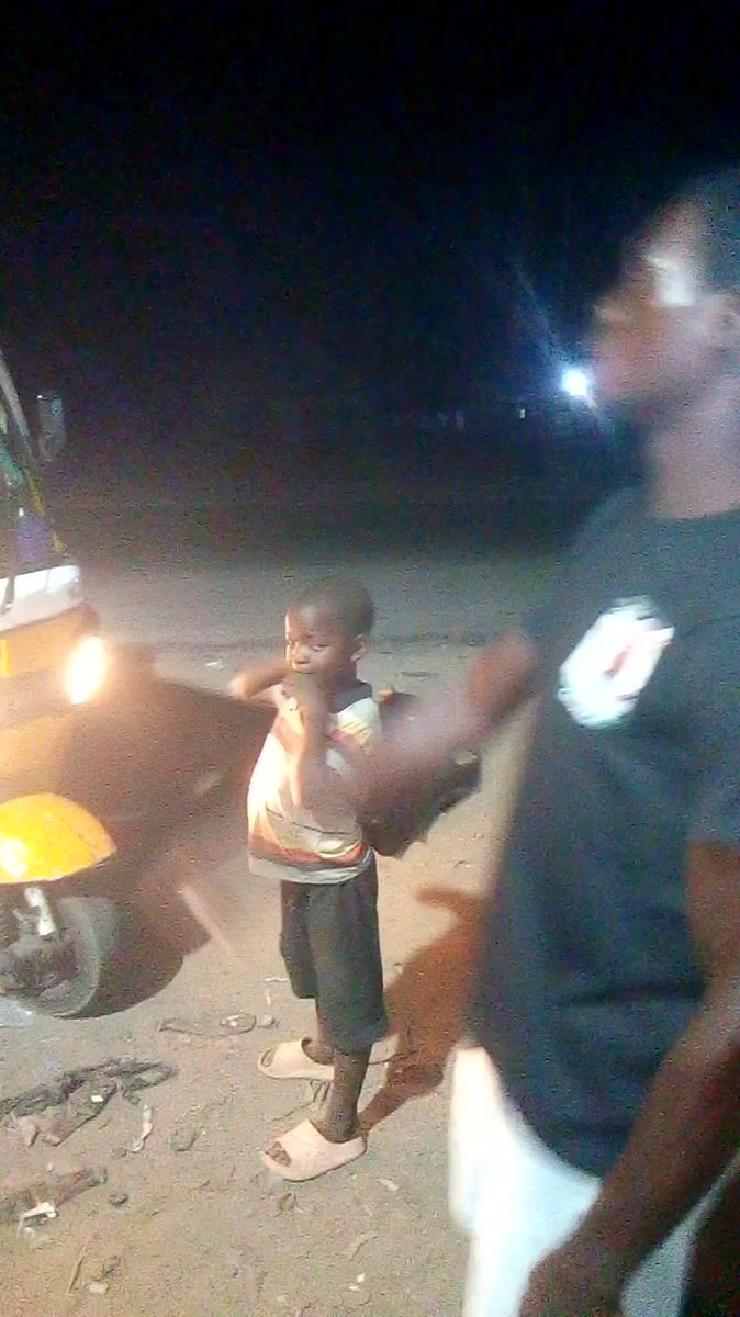 Person observed standing on nighttime street amid vehicle glare