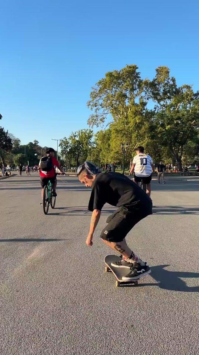 Topics: skateboard trick, blue hair, park skating, skateboarding, street sport, youth culture, recreation, urban sport, evening activity, daily life
