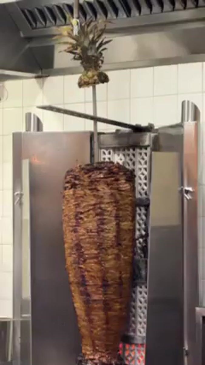 Topics: taco preparation, vertical rotisserie, late night dining, mexican food, restaurant kitchen, food service, culinary, nightlife, urban, daily life