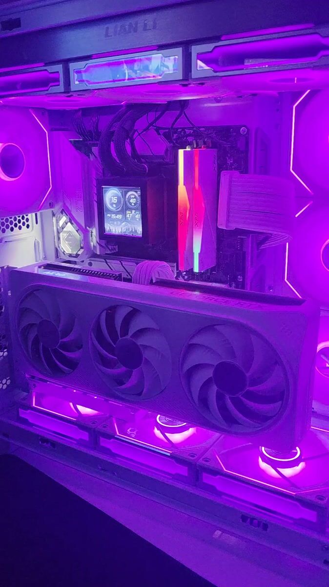 Topics: pc build, purple led, lian li case, gaming setup, computer hardware, tech showcase, electronics, indoor, technology, urban