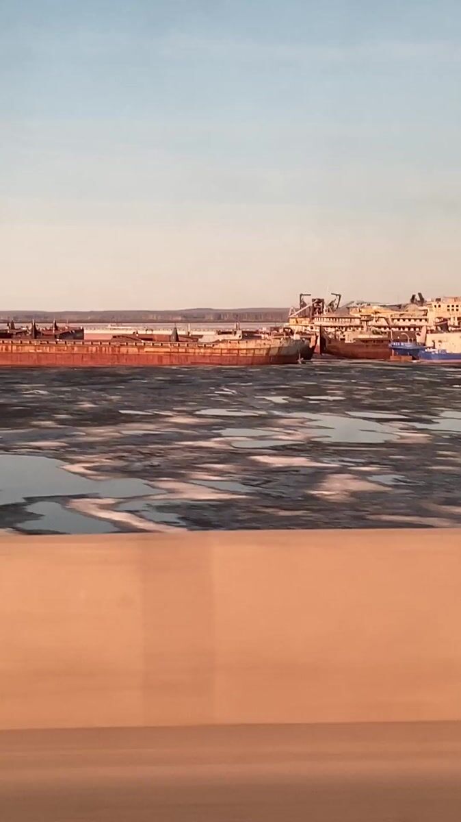 Topics: frozen water, harbor vessels, spring ice, waterway, highway view, infrastructure, transportation, urban, seasonal, daily life
