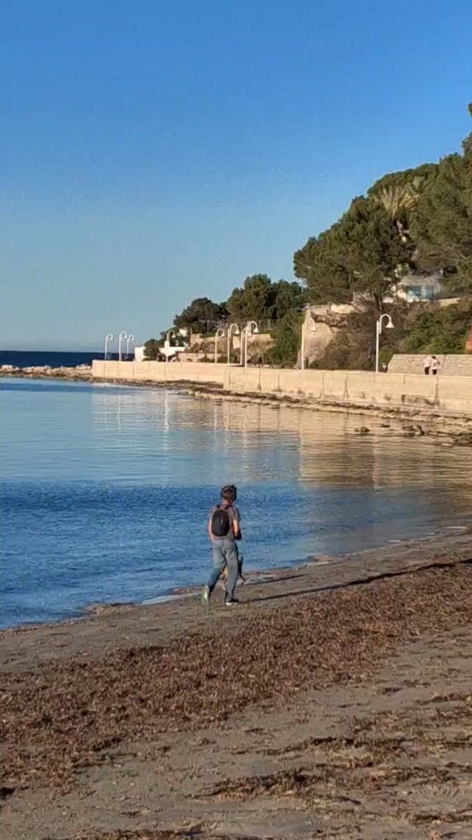 Topics: dog walking, beach stroll, sunny afternoon, leisure, outdoor activity, coastal, recreation, daily life, spain, lifestyle