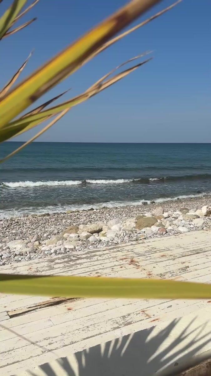 Topics: pebble beach, palm fronds, outdoor cafe, morning scenes, beach, coastal, tourism, leisure, mediterranean, daily life