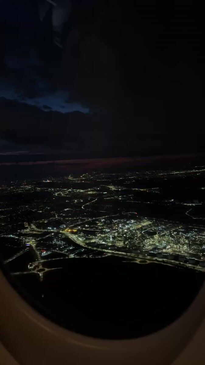Topics: airplane window, aerial view, city lights, nighttime, aviation, urban landscape, travel, cityscape, aerial, night