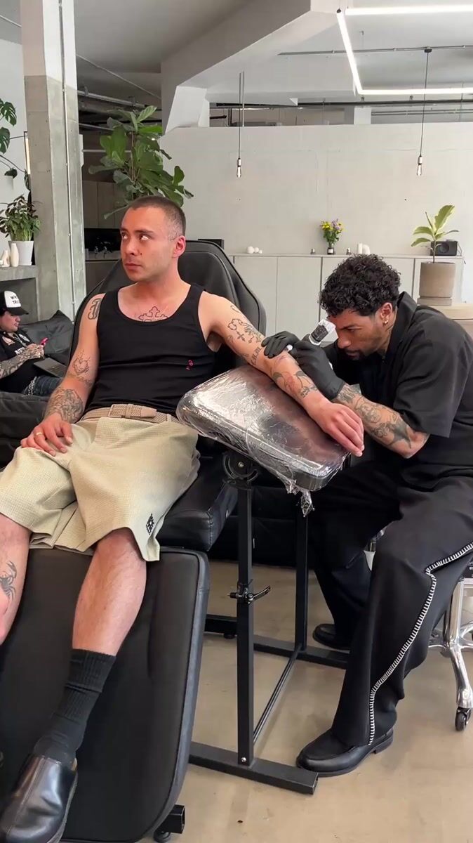 Topics: forearm tattoo, tattoo parlor, body art, tattoo session, indoor studio, personal grooming, body modification, lifestyle, urban culture, daily life