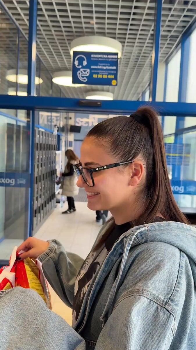 Topics: snack shopping, store exit, casual wear, afternoon activity, pedestrian, retail, daily life, urban, social, bulgaria