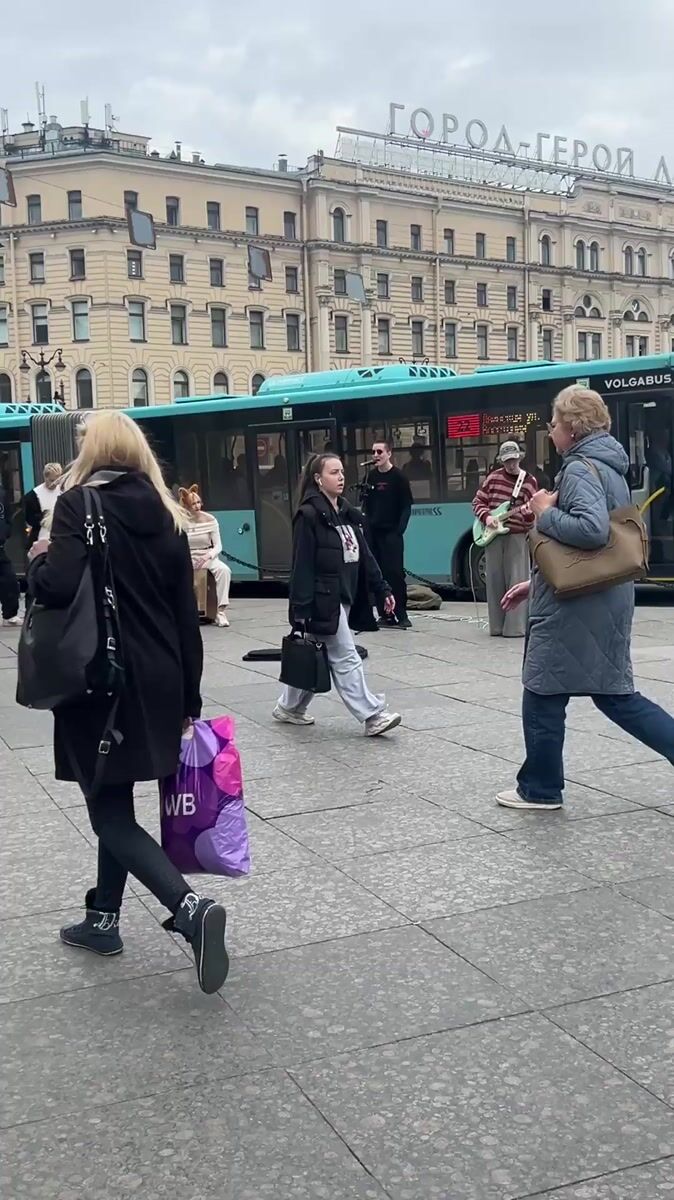 Street musicians perform in Saint Petersburg square amid pigeons