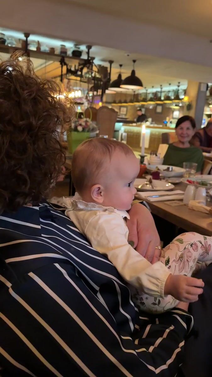 Topics: baby dining, restaurant scene, caregiver moment, family dining, indoor dining, social gathering, family life, daily life, social, urban
