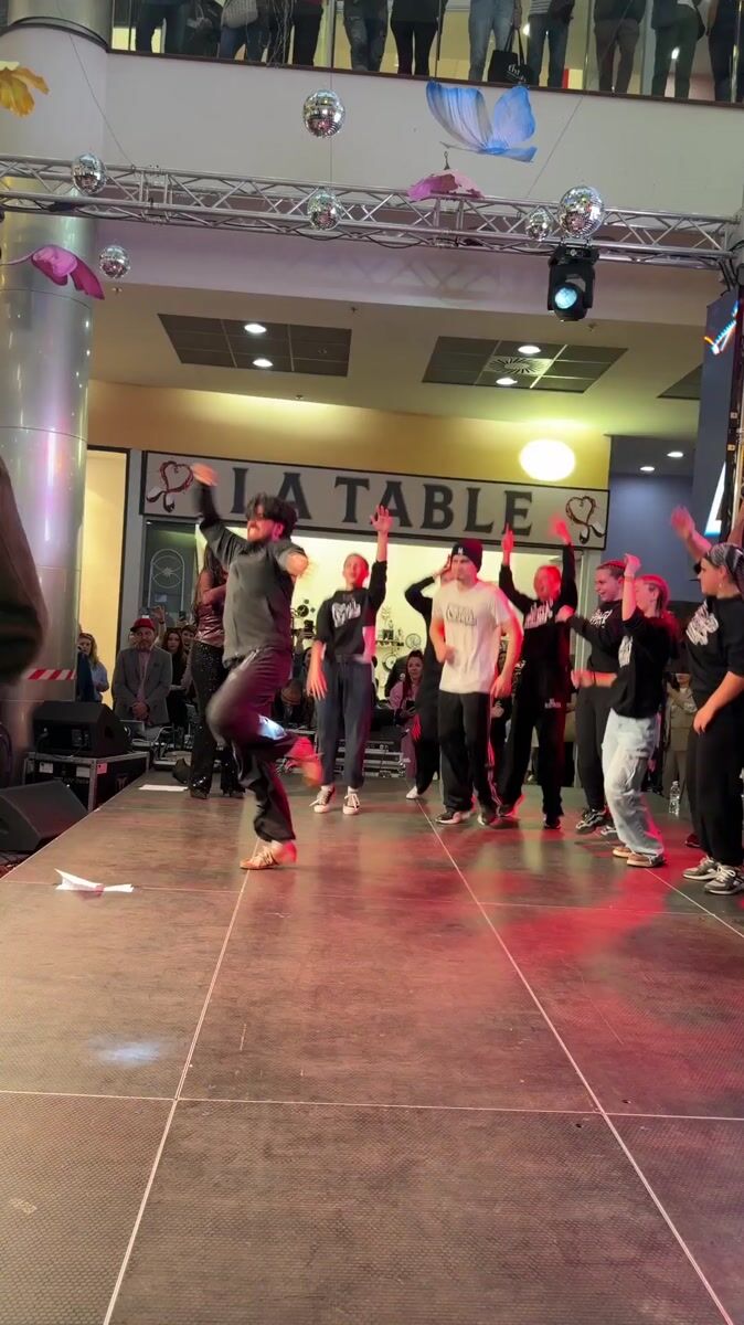 Topics: dance performance, synchronized routine, shopping mall, performance, entertainment, public event, youth activity, community, indoor venue, cultural
