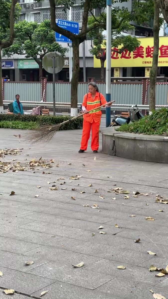 Topics: street sweeping, street vendor, electric moped, smartphone, evening activity, urban life, daily routine, street scene, social, daily life