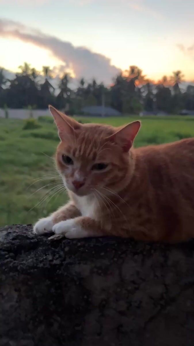 Topics: orange tabby cat, rice paddies, village sunset, rural landscape, twilight sky, peaceful evening, nature, village life, rural, daily life