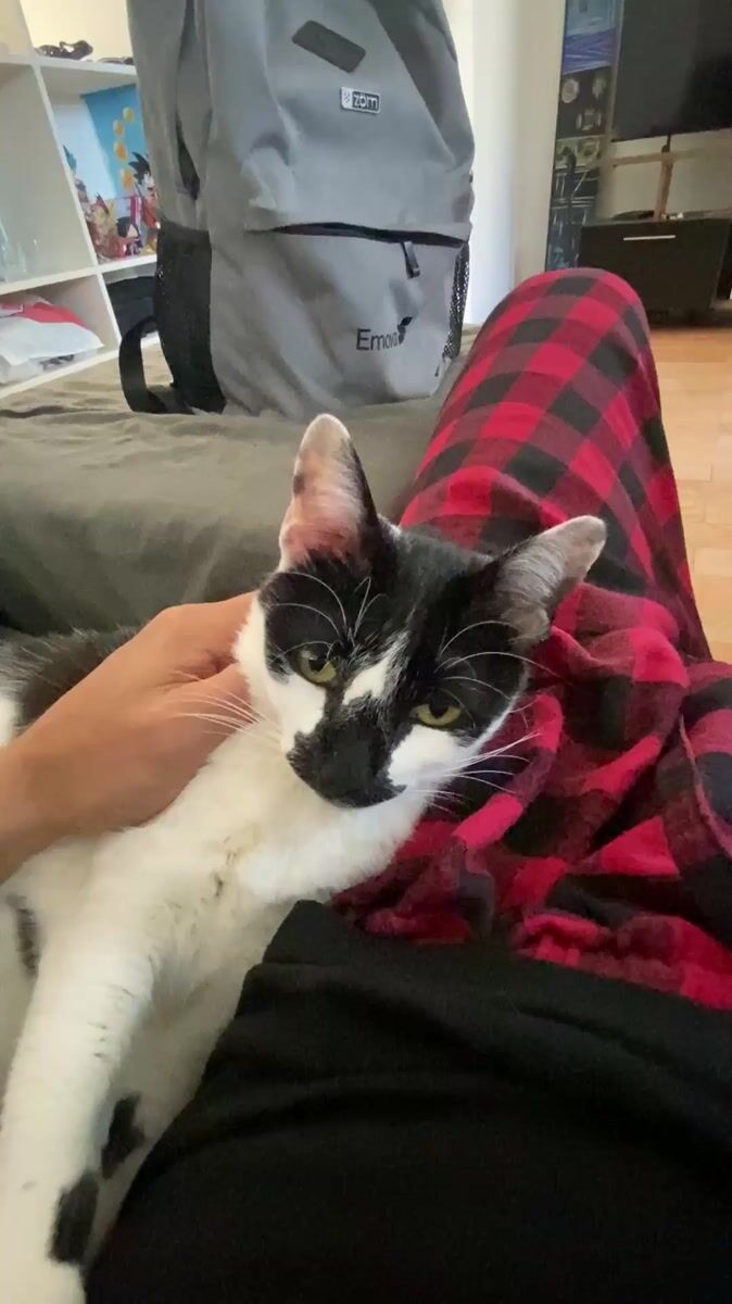 Topics: cat petting, black white cat, grey couch, pet interaction, indoor scene, domestic life, home, comfort, daily life, animal
