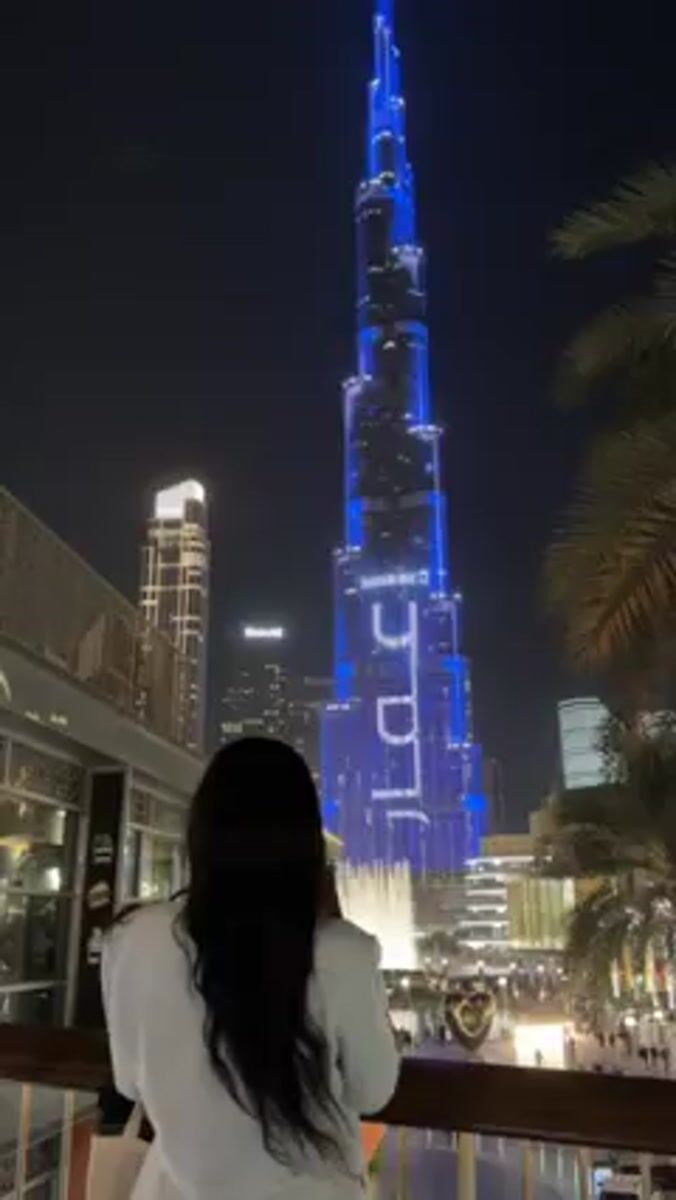 Woman views illuminated Burj Khalifa from Dubai balcony