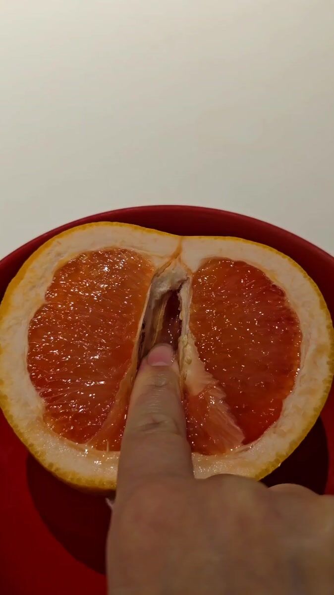 Person touches halved grapefruit in red bowl, Khimki