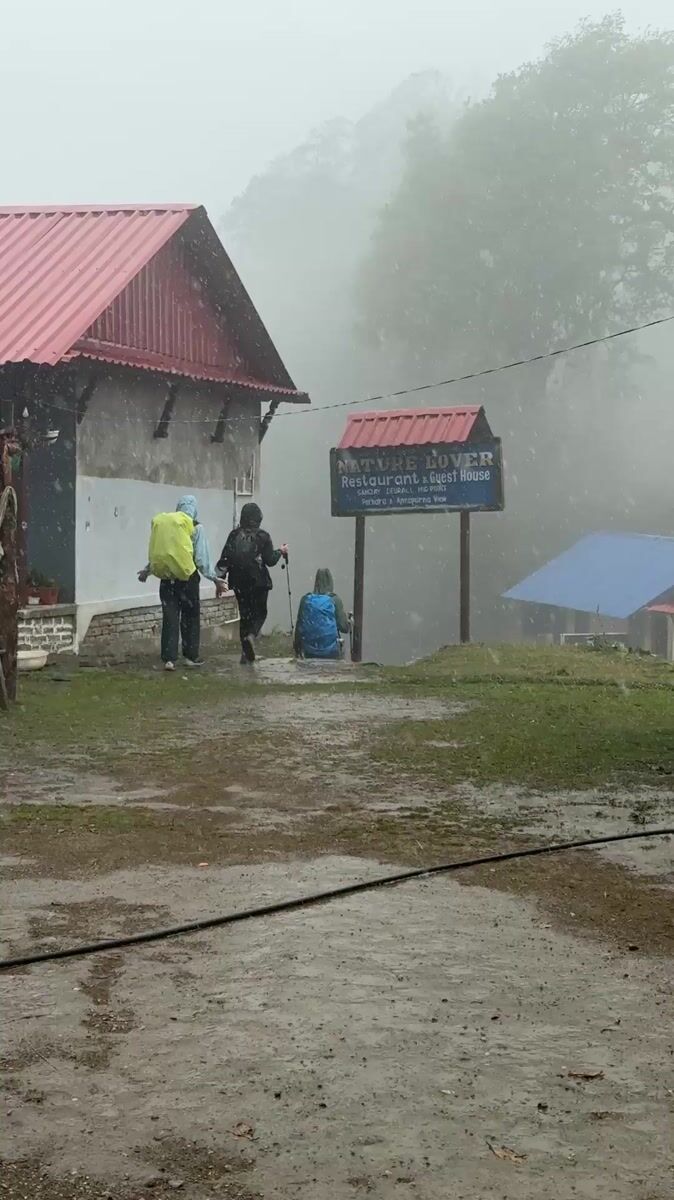 Trekkers navigate muddy path in misty conditions at Dhampus Phedi