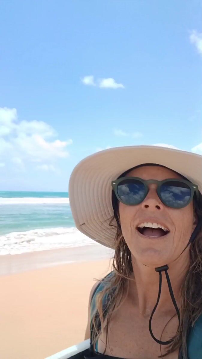 Topics: beach selfie, boogie board, woman filming, beach recreation, water sport, tourism, leisure, coastal, social media, daily life