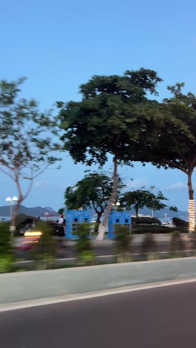 Vehicle travels coastal road in Nha Trang during evening hours