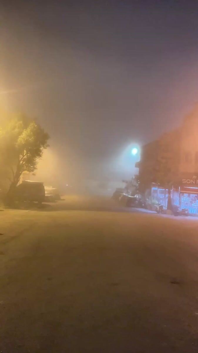 Topics: thick fog, street lamp, night visibility, atmospheric condition, weather, urban street, nighttime, coastal city, morocco, daily life