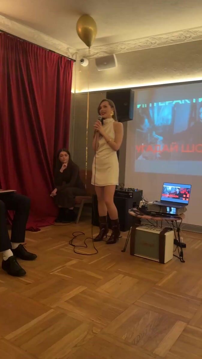 Woman delivers speech at Moscow event with projection screen