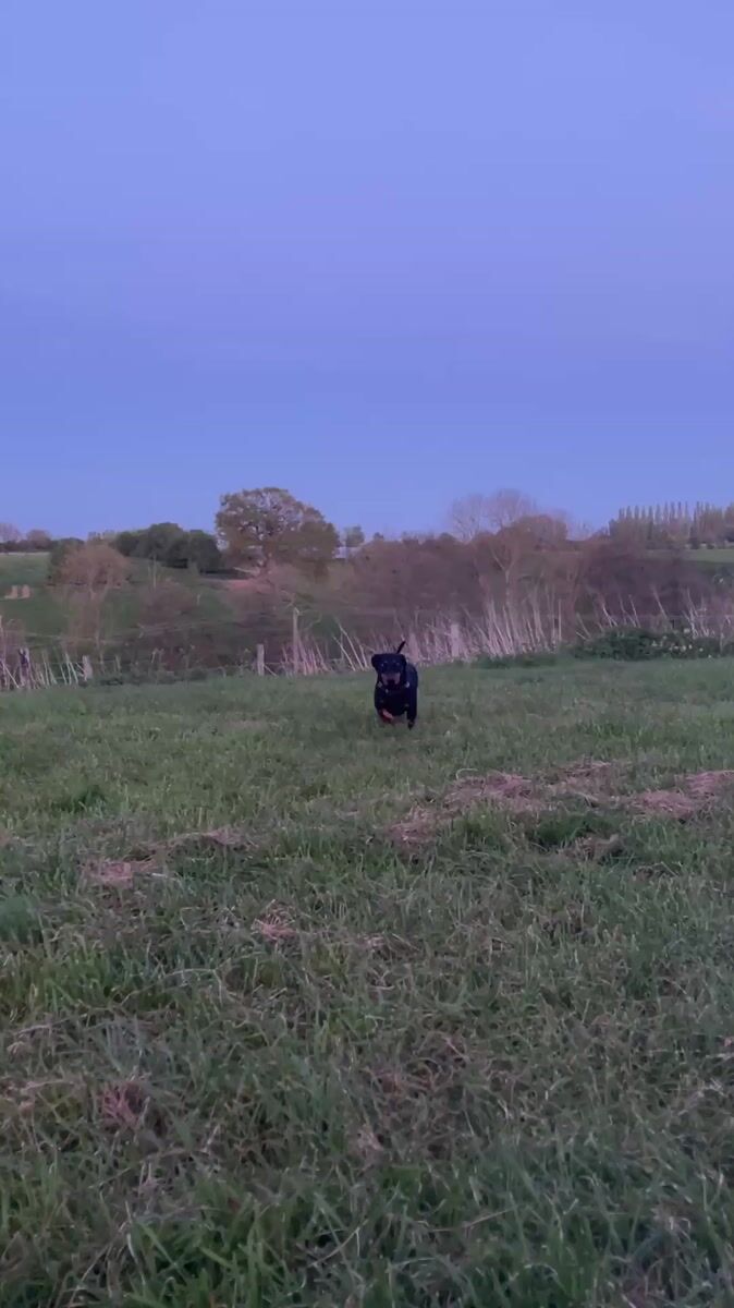 Black dachshund plays in spring fields near Maidstone