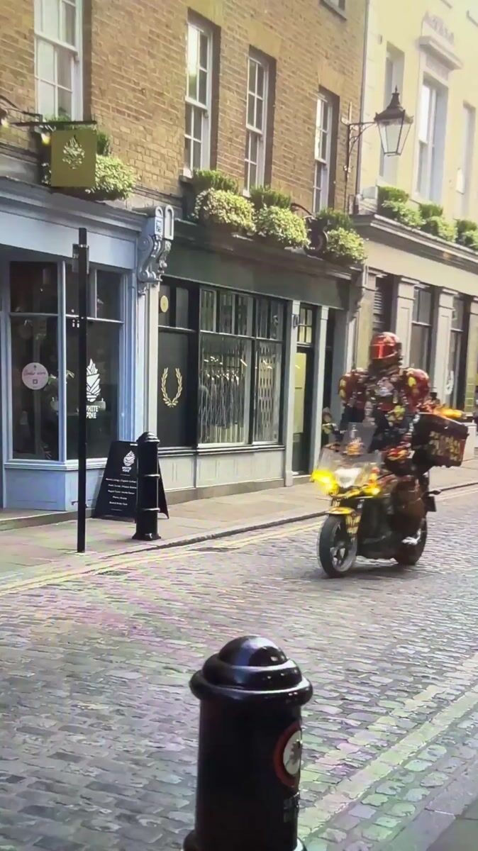 Colorfully dressed motorcyclist rides customized bike through London cobblestone streets