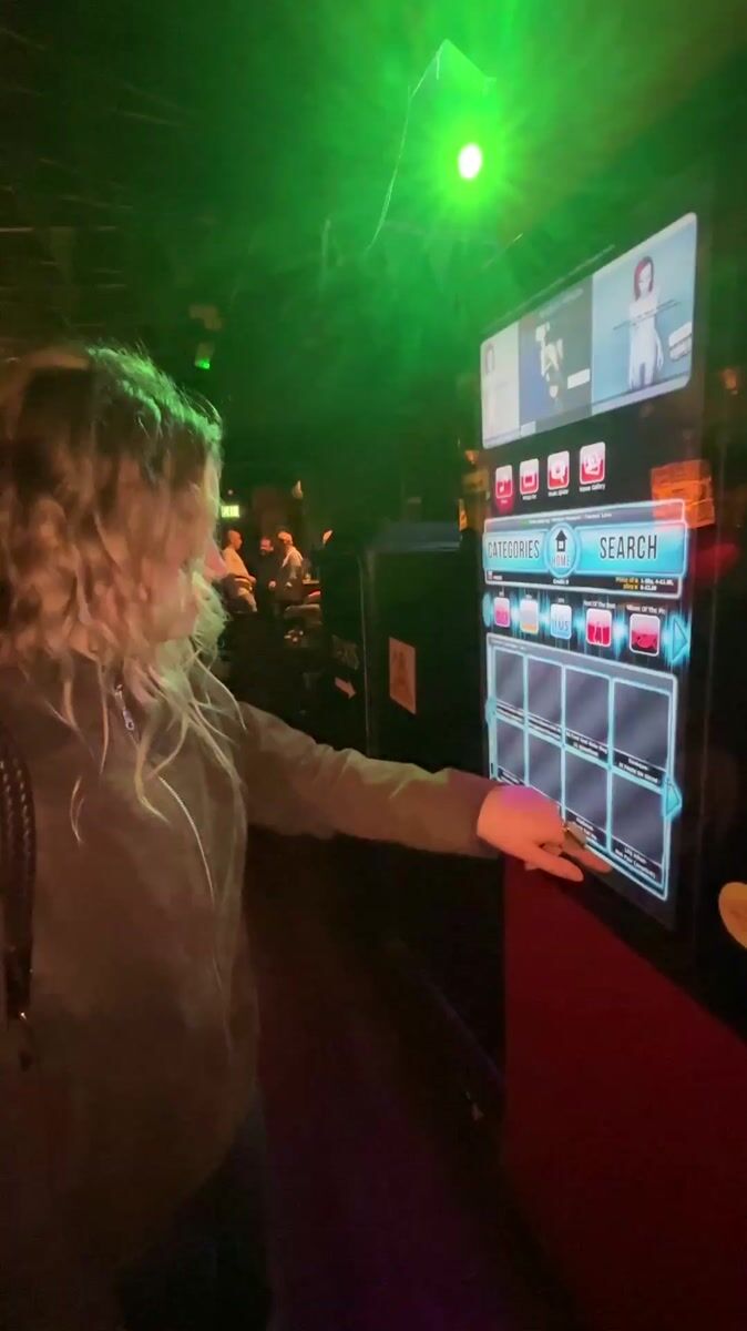 Topics: digital jukebox, music selection, bar entertainment, nightlife, music decades, touchscreen interface, social gathering, entertainment, urban, technology