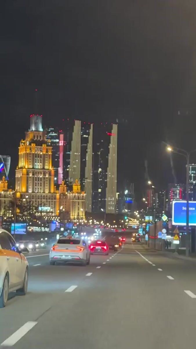 Topics: evening traffic, vehicle headlights, multi-lane road, urban traffic, nighttime driving, city street, transportation, urban, moscow, daily life
