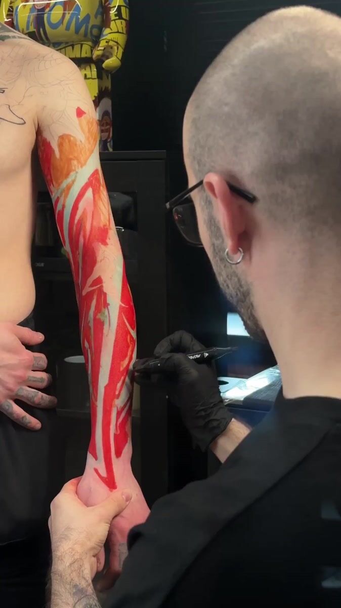 Topics: tattoo session, modern architecture, glass panels, body art, urban building, morning scene, moscow, lifestyle, urban, daily life